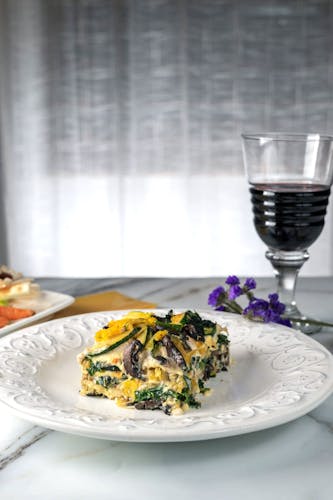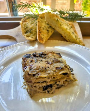 Italian Artisanal Family-Size lasagna served on 8 inches square aluminum tray made with homemade Lasagna Sheets Egg Pasta, Mixed Winter Squash, Spaghetti Squash, Braised Napa Cabbage, homemade Bechamel aromatizes with Sage & mozzarella cheese.